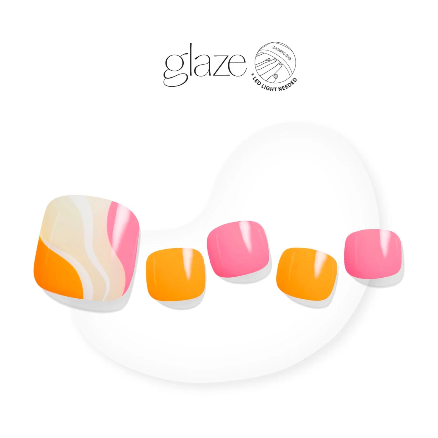 Semi-cured sheer nude, orange, and pink gel pedicure strips featuring abstract color blocking & wavy line art with mega volume & maximum shine.
