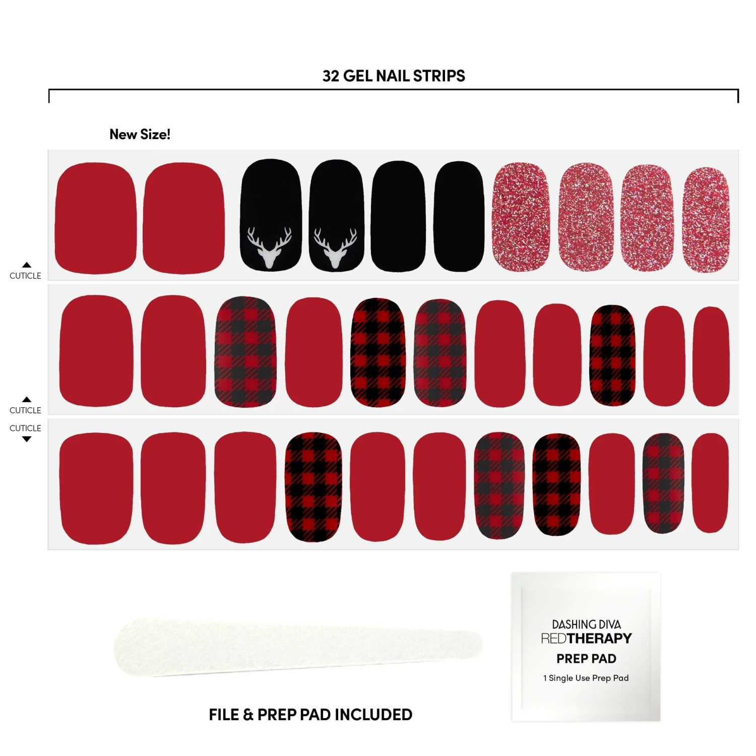 What’s black & red & plaid all over? Your next mani. Red & black gel strips featuring a classic plaid print, moose decals, and a silver glitter overlay.