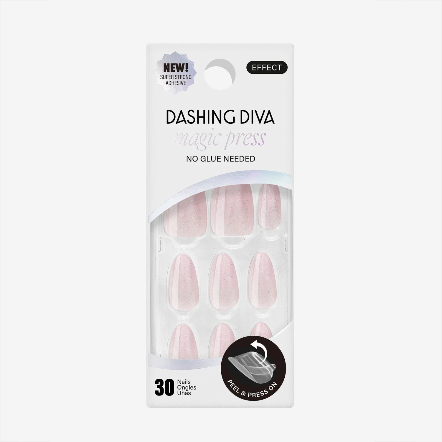 Pretty, pink, and perfect. 💁🏼♀️ Medium length, almond shape, glossy finish. White-to-pink ombré press-on gel nails featuring iridescent glitter.