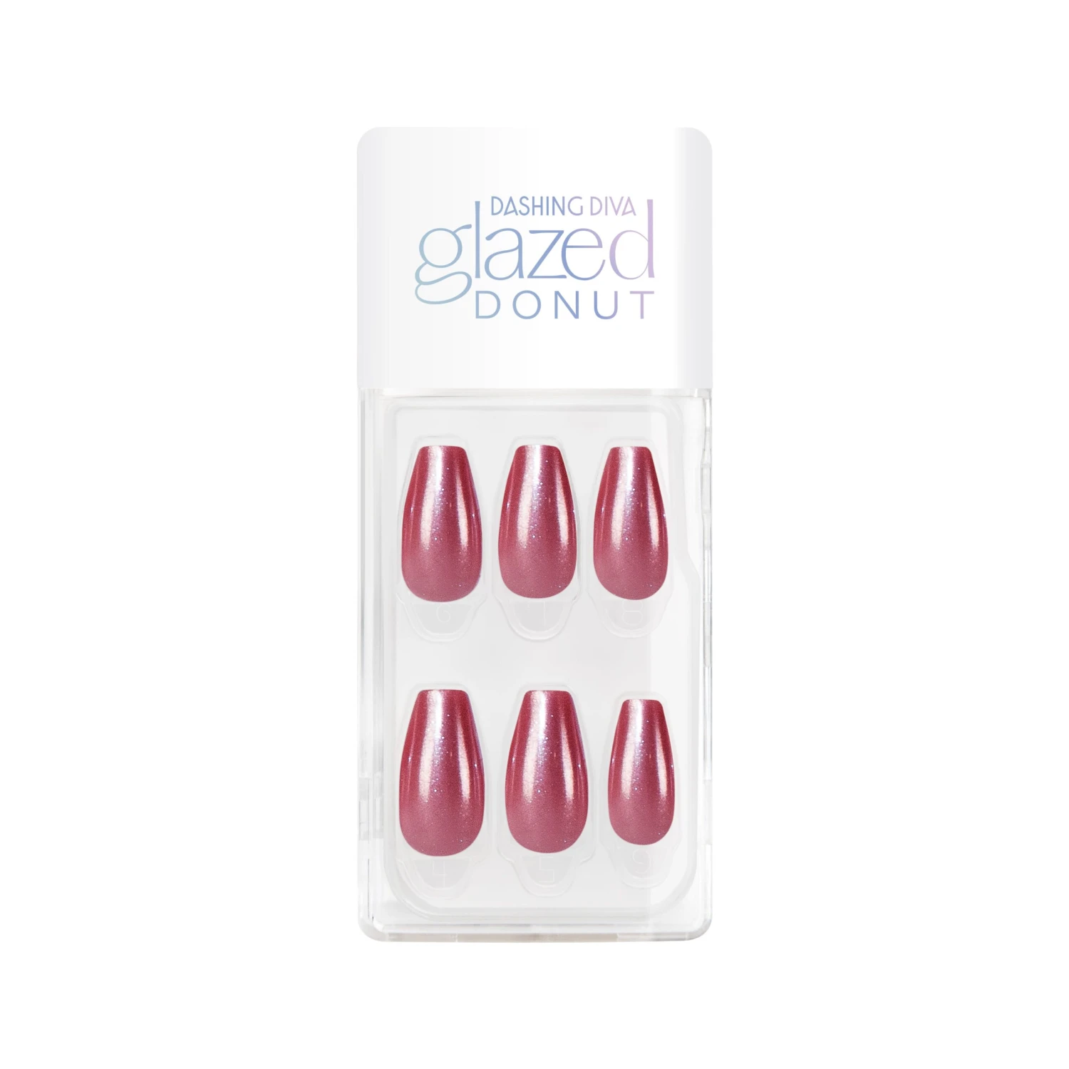 Deep purple press-on gel nails featuring, long length, coffin shape, and a shimmery chrome finish.