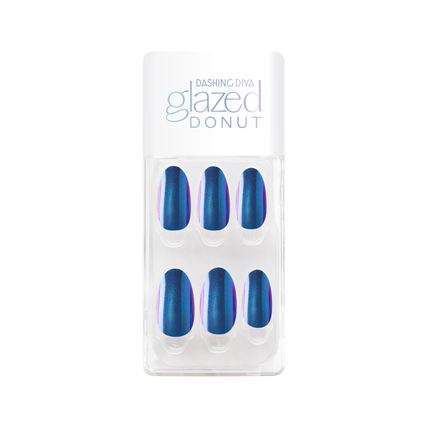Reflective blue press-on gel nails featuring a medium-length, almond shape, with a metallic chrome finish.