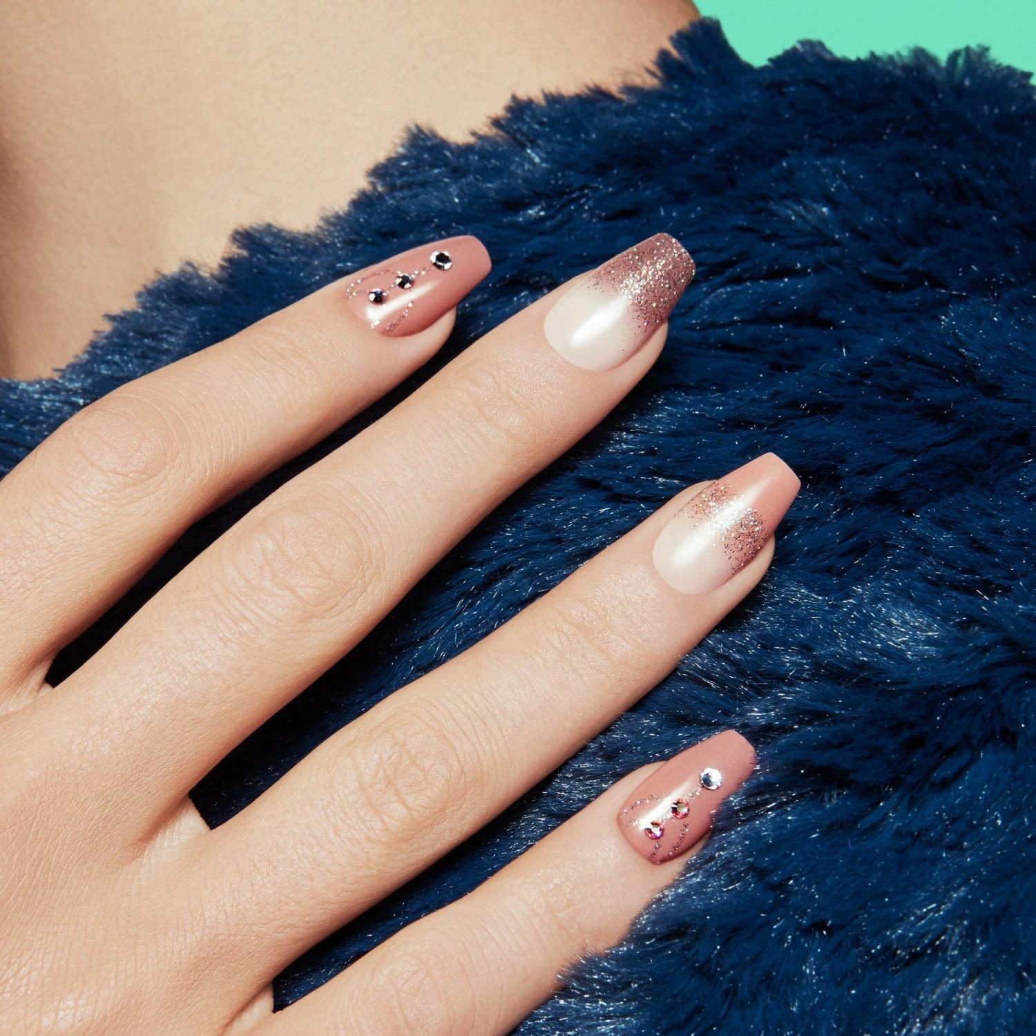 Long length, coffin shape, glossy finish press-on gel nails. A soft peach and tan base color features an ombré glitter effect with rhinestones that remind us of Saturn’s Rings.