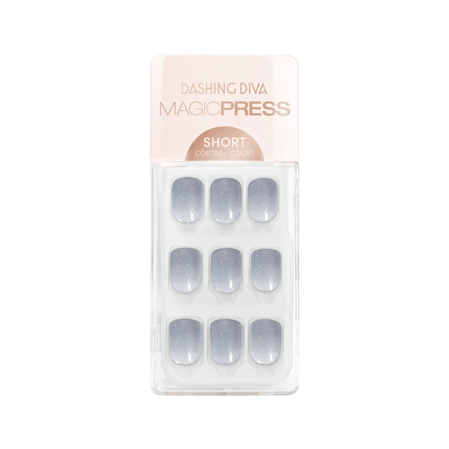 Shimmer down from whatever universe you find yourself best suited for. Short length, square shape, glossy finish blue-gray ombré press-on gel nails featuring silver glitter.