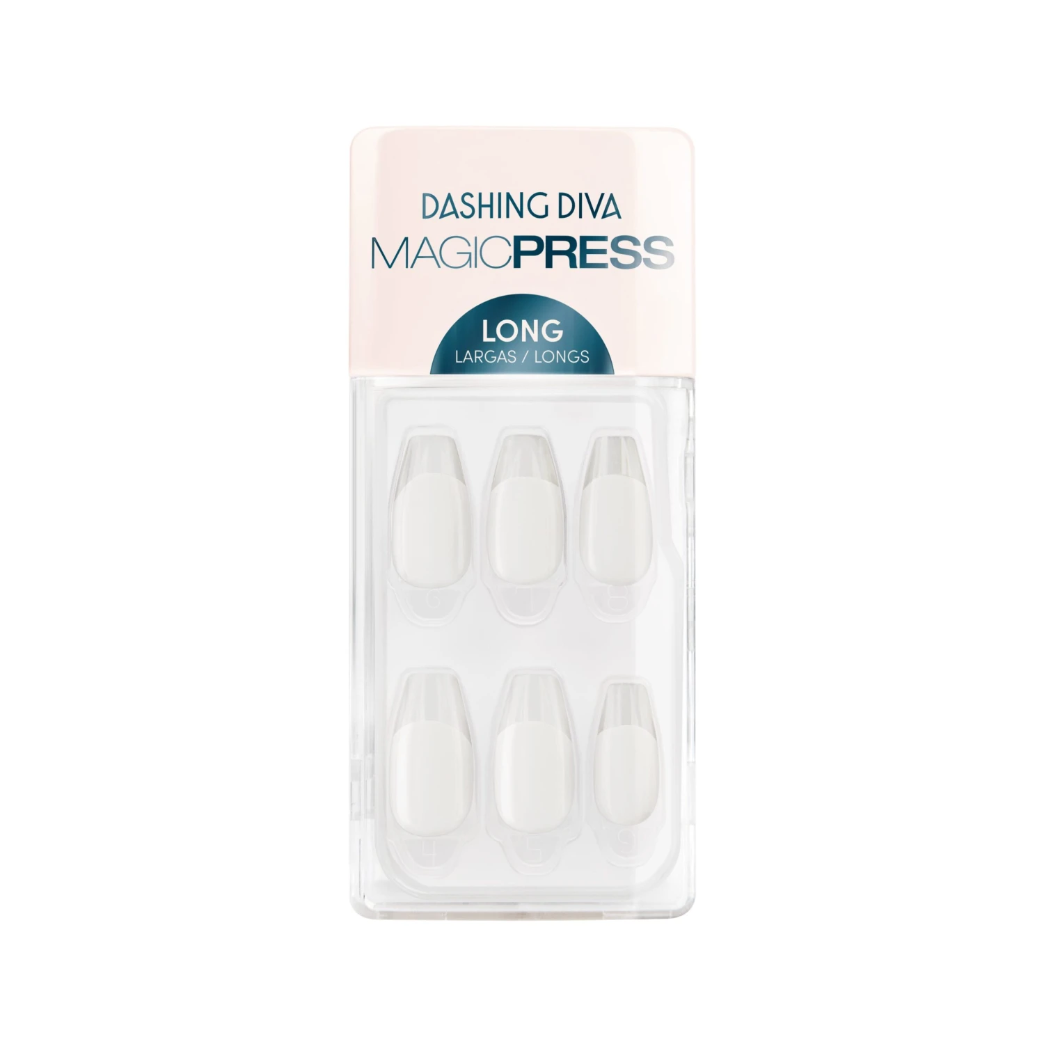 Long length, coffin shape, glossy finish press-on gel nails. Clear, retro French tips might single you out but that isn’t always a bad thing!