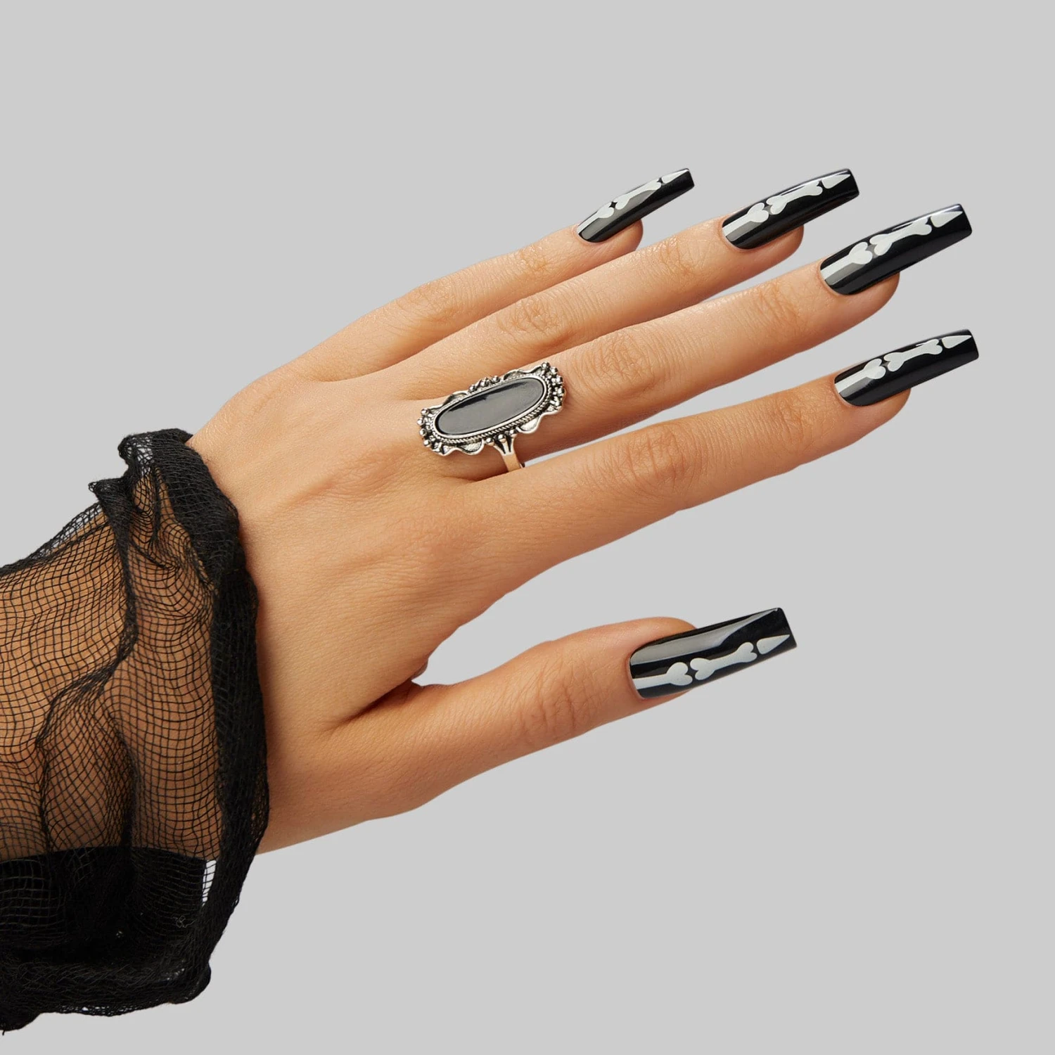 Extra long length, coffin shape, glossy finish. Black glue-on gel nails featuring skeleton bone accents.