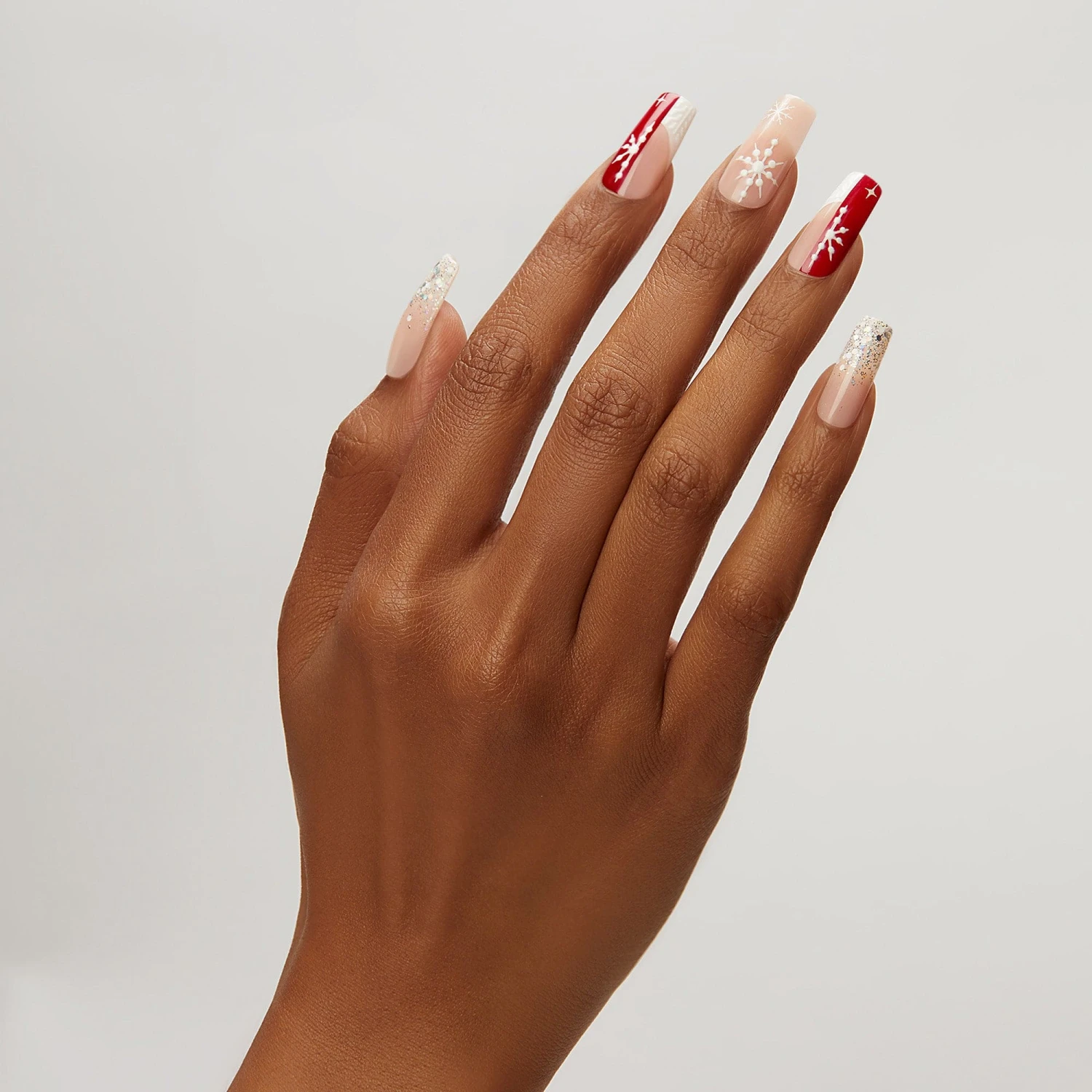 The perfect snowflake doesn’t exi- Long length, square shape, glossy finish. Sheer nude pink glue-on gel nails featuring ombré french tips with silver glitter and iridescent confetti glitter.