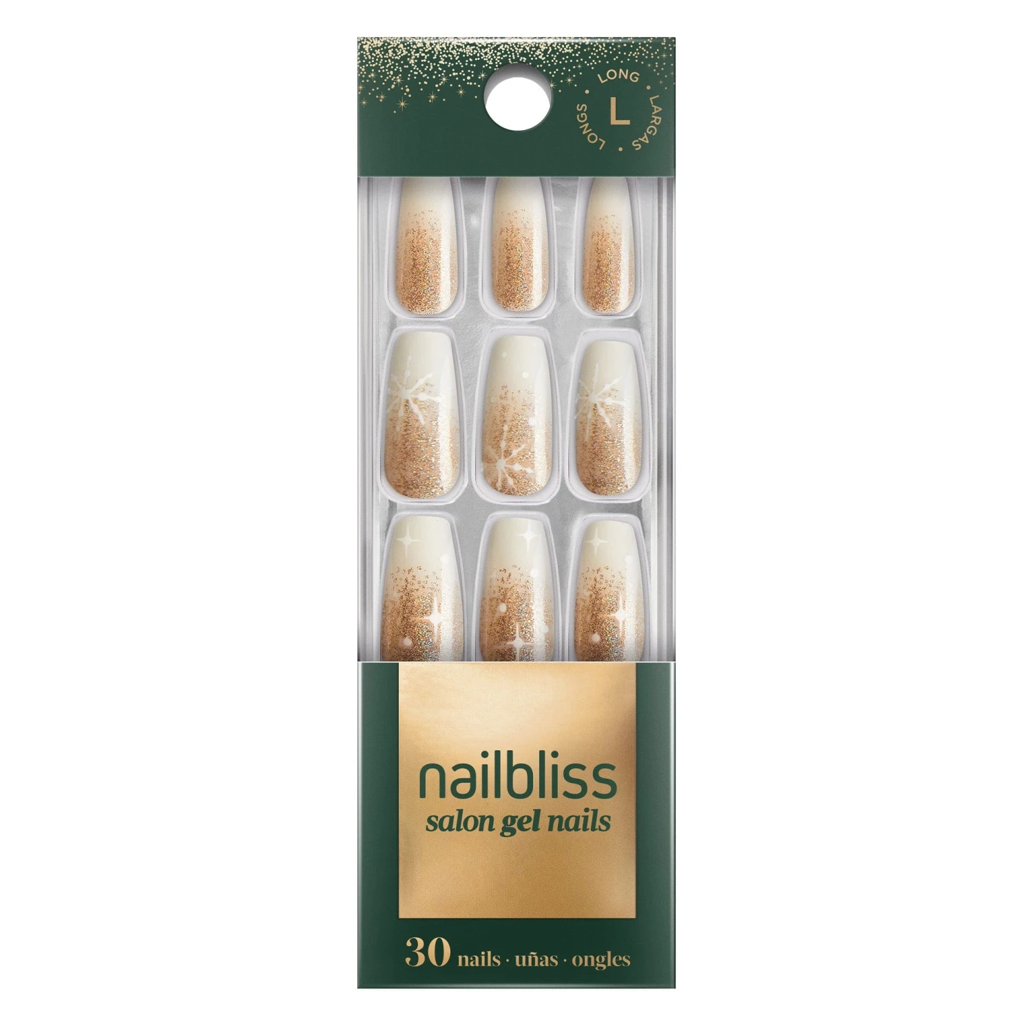 Sunkissed in the summer, snowkissed in the winter. Long length, coffin shape, glossy finish. Milky white glue-on gel nails featuring ombré gold glitter and snowflake accents.