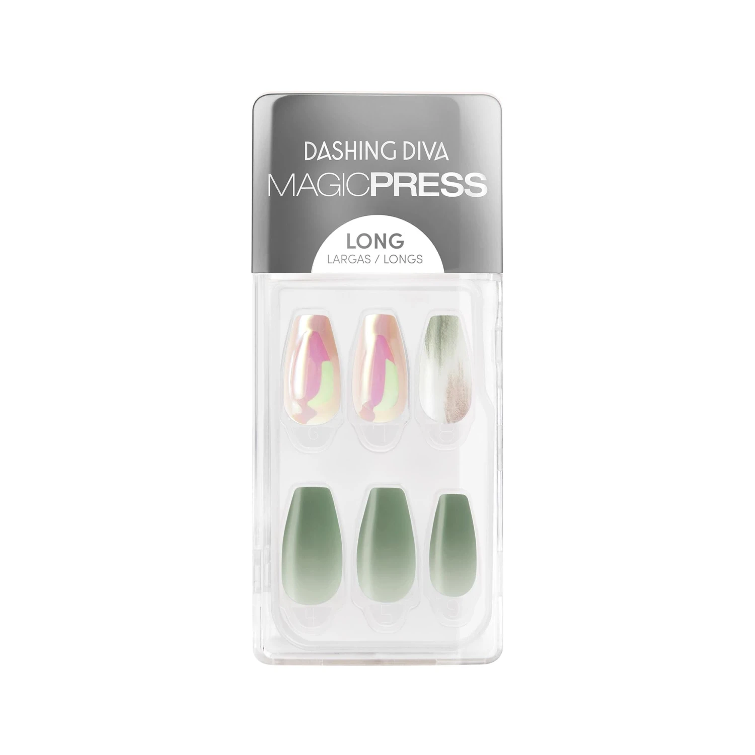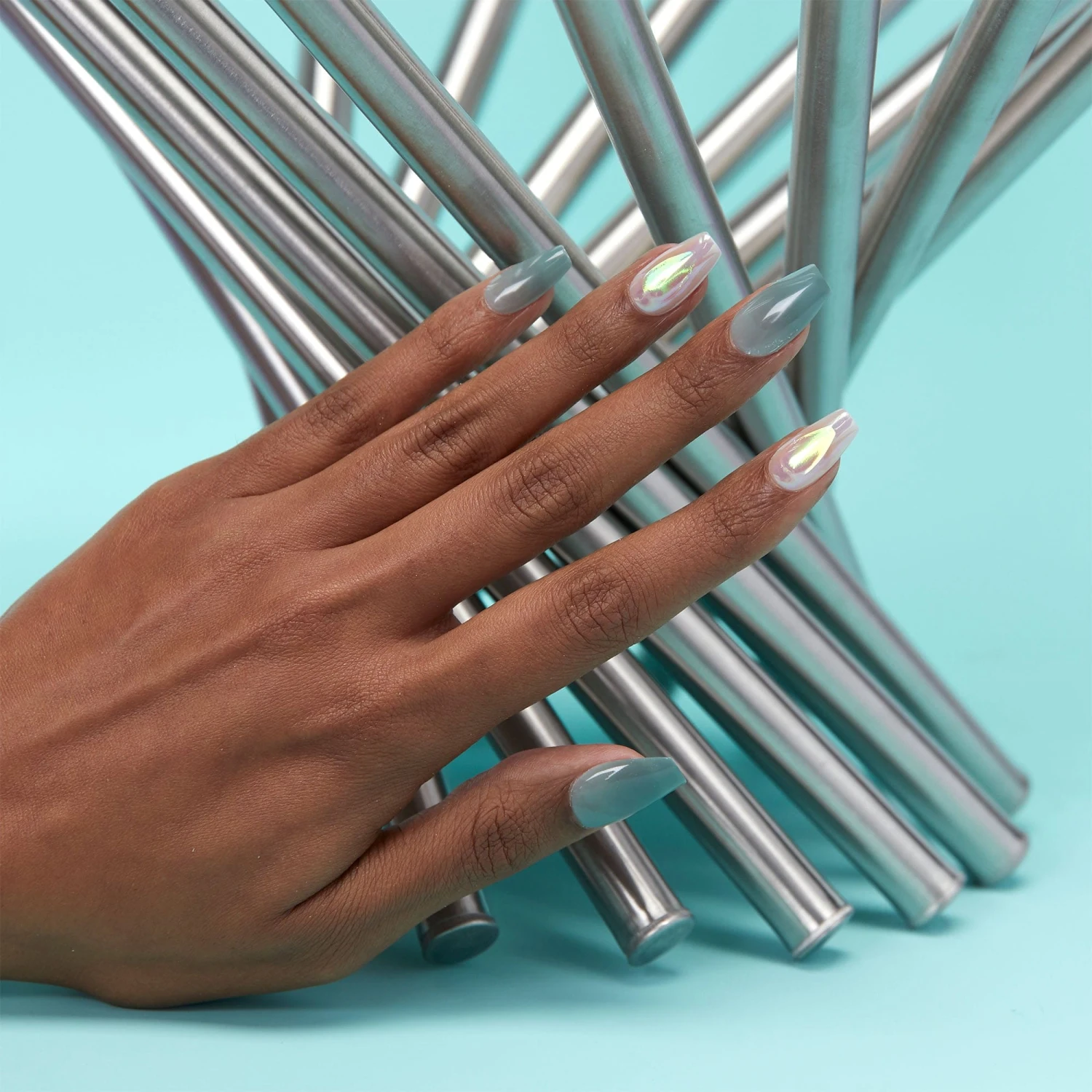 Long length, coffin shape, glossy finish press-on gel nails. Finely touched with advanced intergalactic artistry.