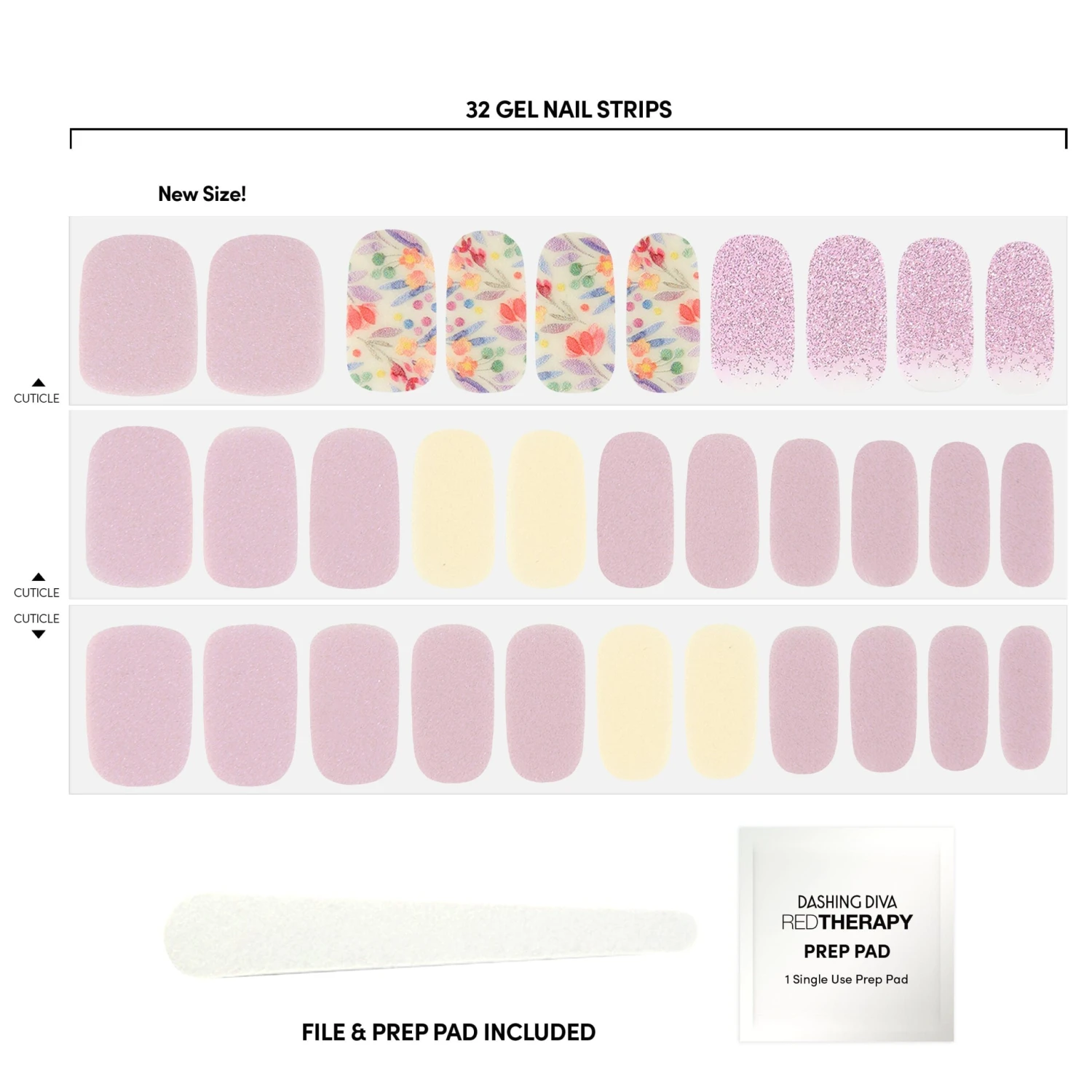 After a long winter, bring some Spring Shimmer to your nails! Glittered chromatic purple and pearlescent yellow nail strips featuring pressed flowers and ombre glitter accents with a glossy, high-shine finish.
