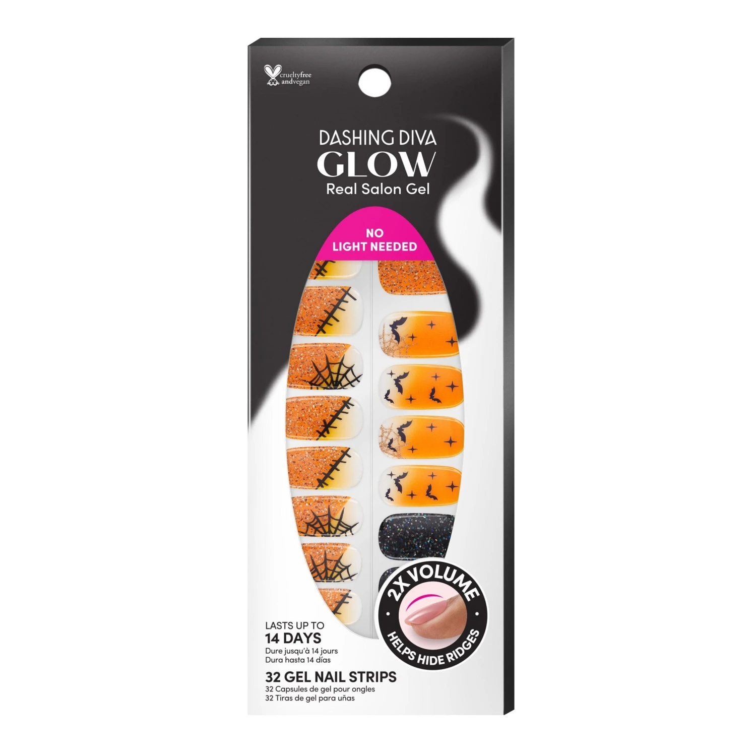 Clear & black gel nail strips featuring asymmetrical orange french tips, bat icons, stitch detailing, and iridescent glitter with a double gel formula for an ultra-smooth finish.