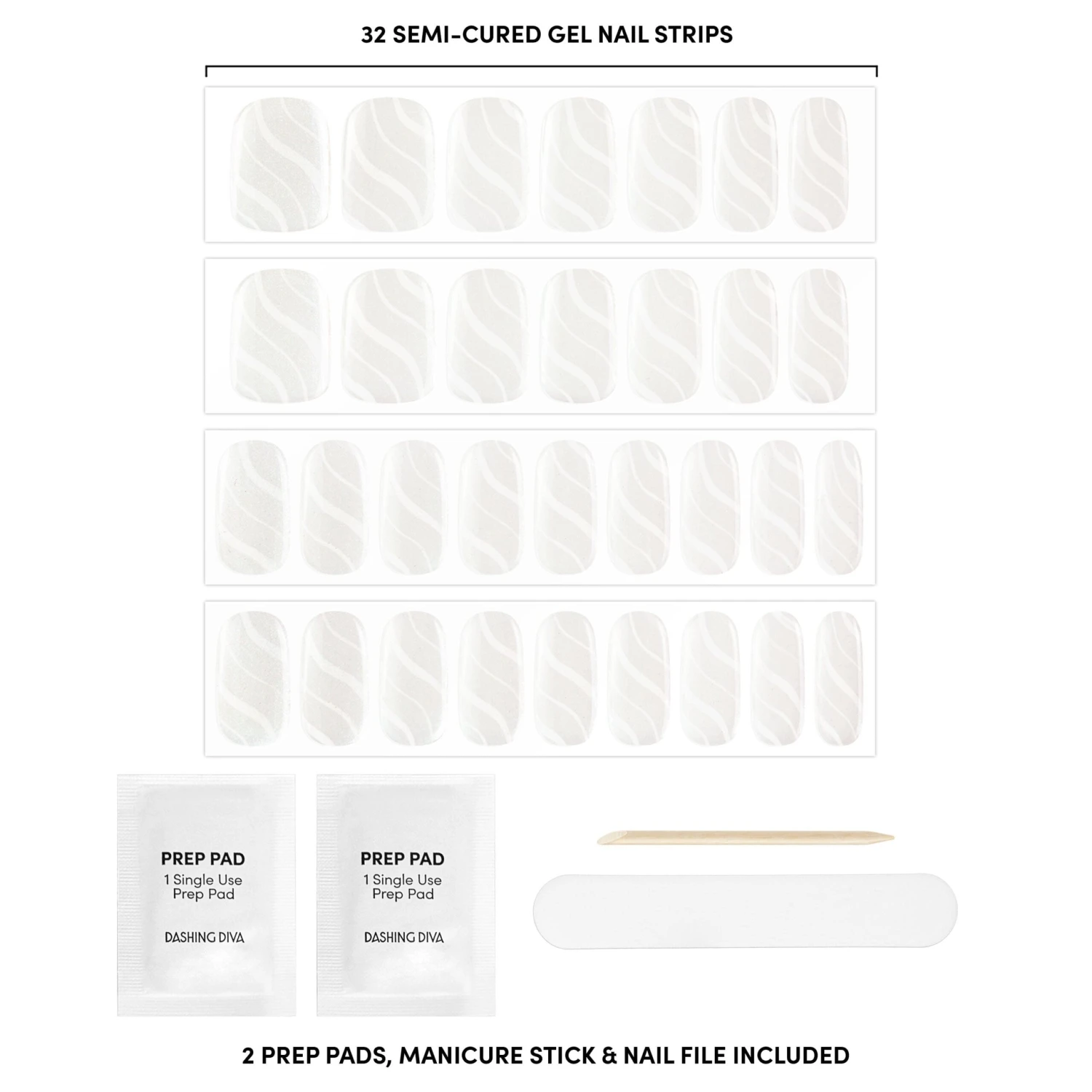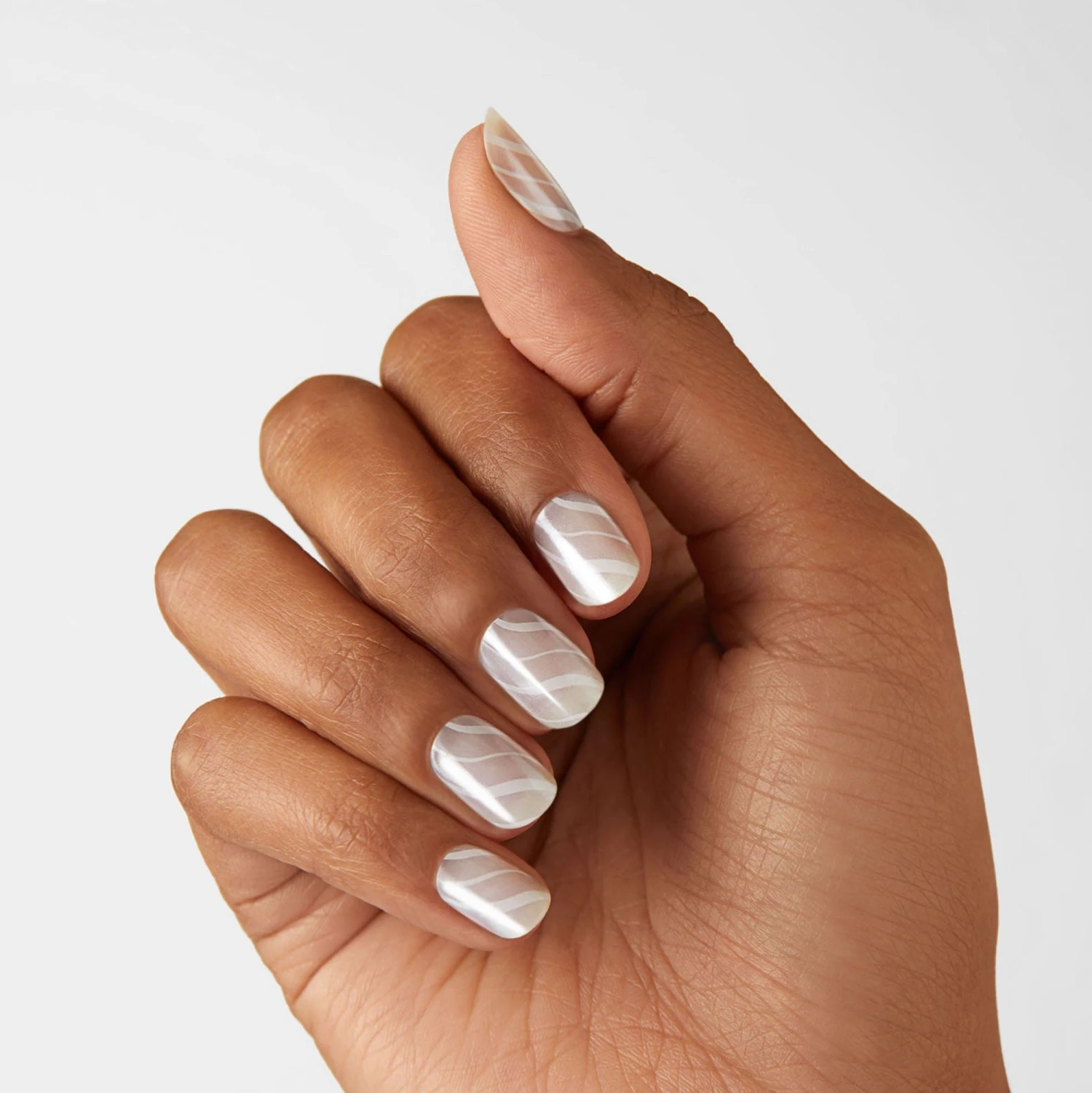 Semi-cured pearly white gel nail strips featuring abstract swirls and a shimmery chrome finish with mega volume & maximum shine.