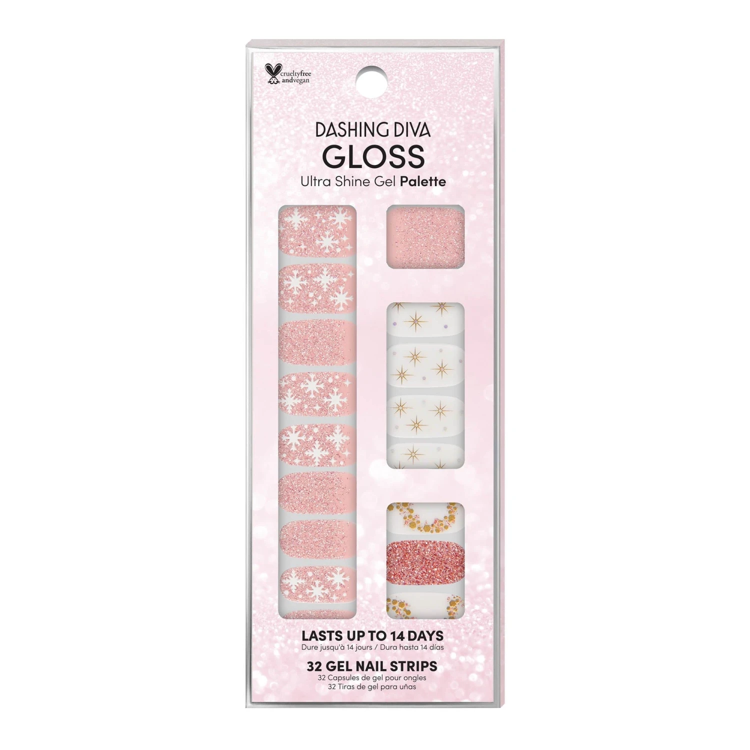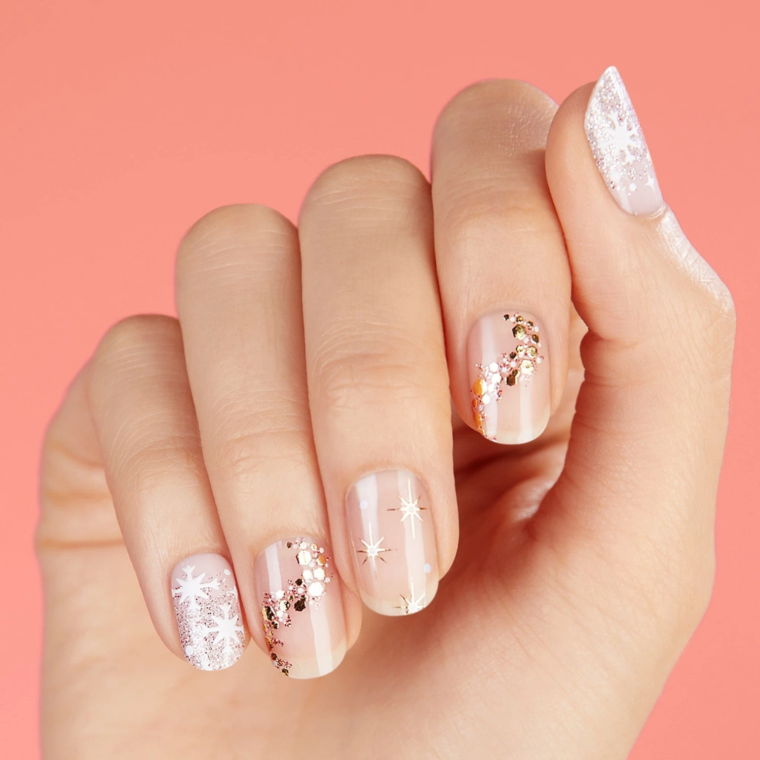Holiday nails on pointe. Sheer nude & blush pink gel nail strips featuring silver & pink glitter, gold foil abstract swirls, and snowflake icons with a glossy, high-shine finish.