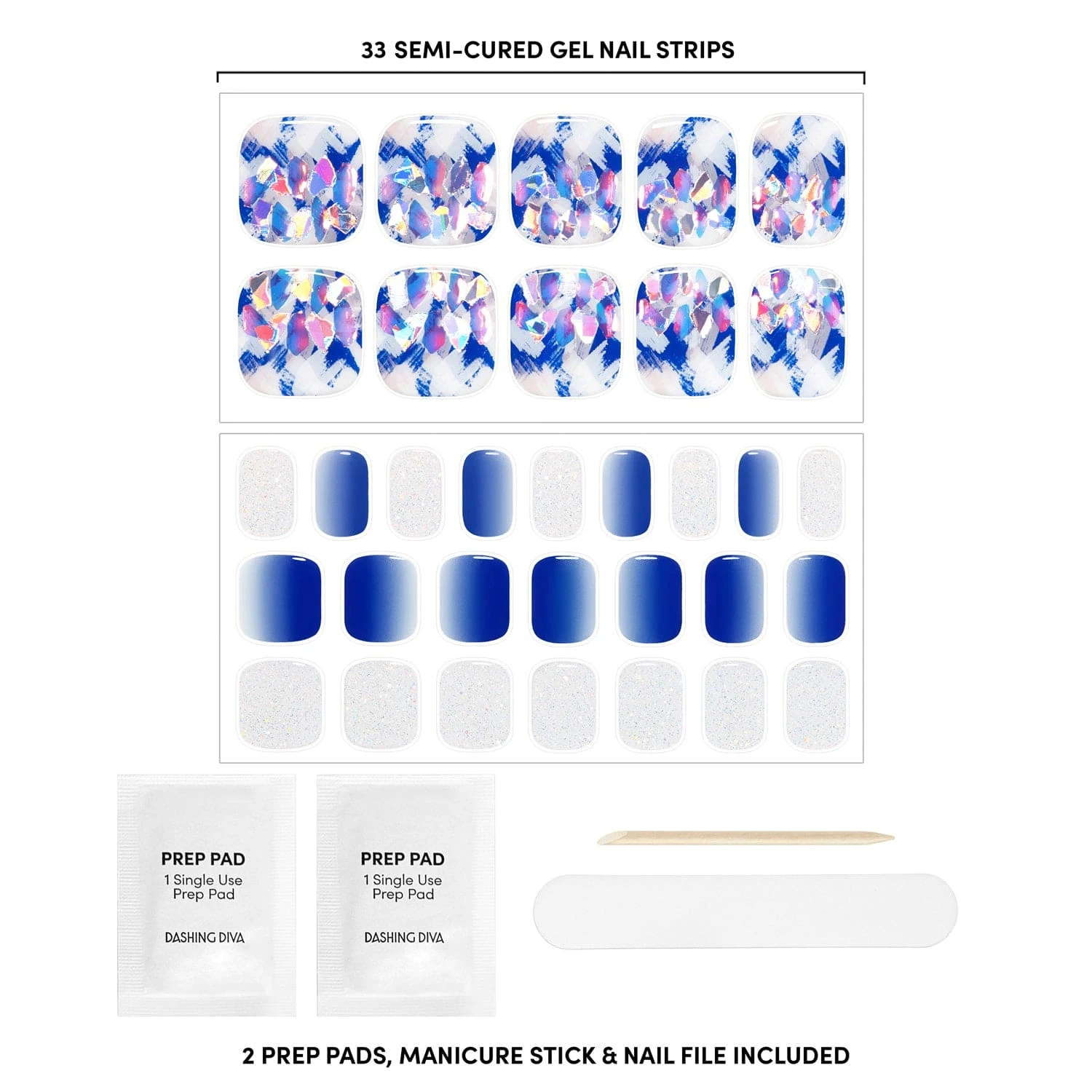 Semi-cured blue, white, and clear gel pedicure strips featuring iridescent glitter and mosaic accents with mega volume & maximum shine.