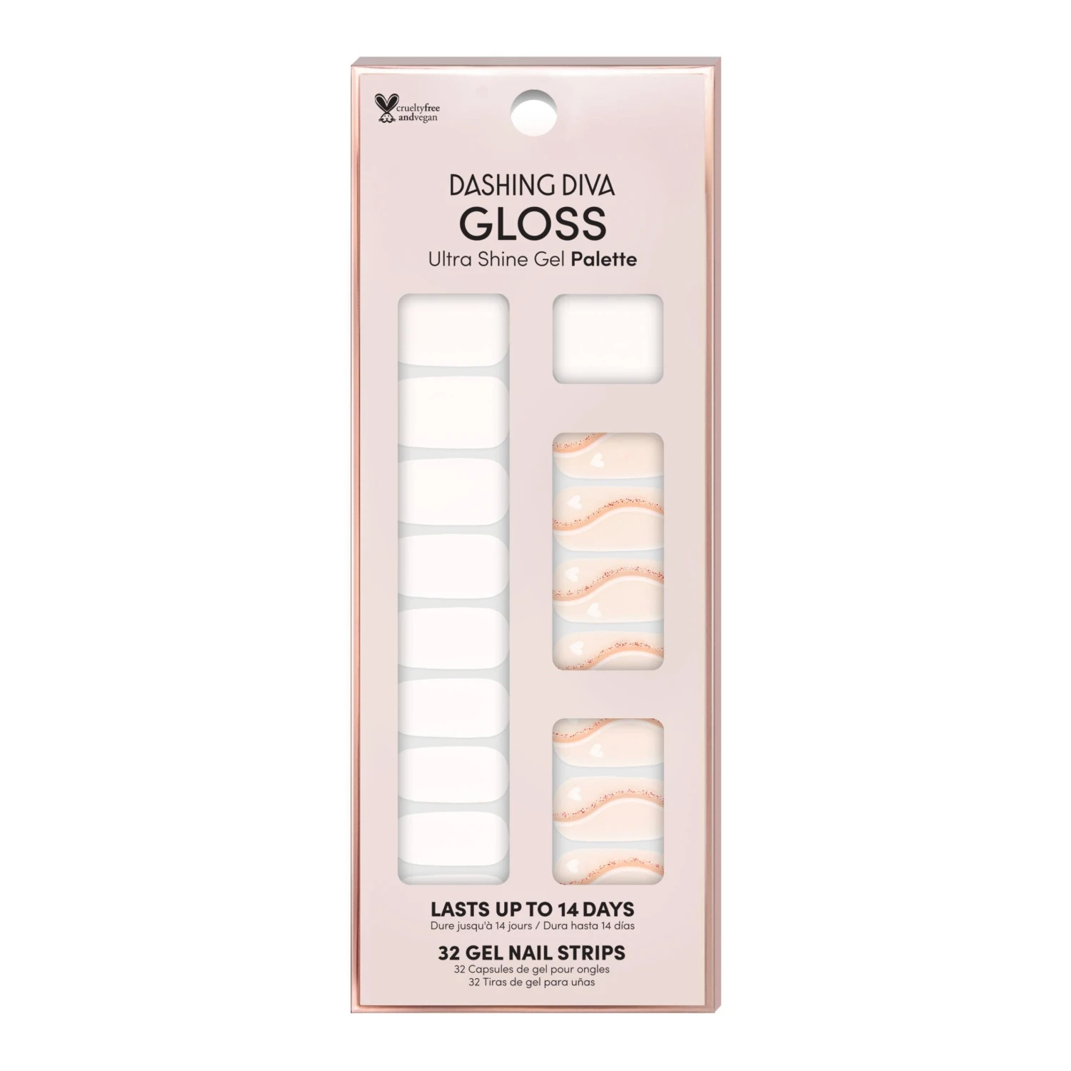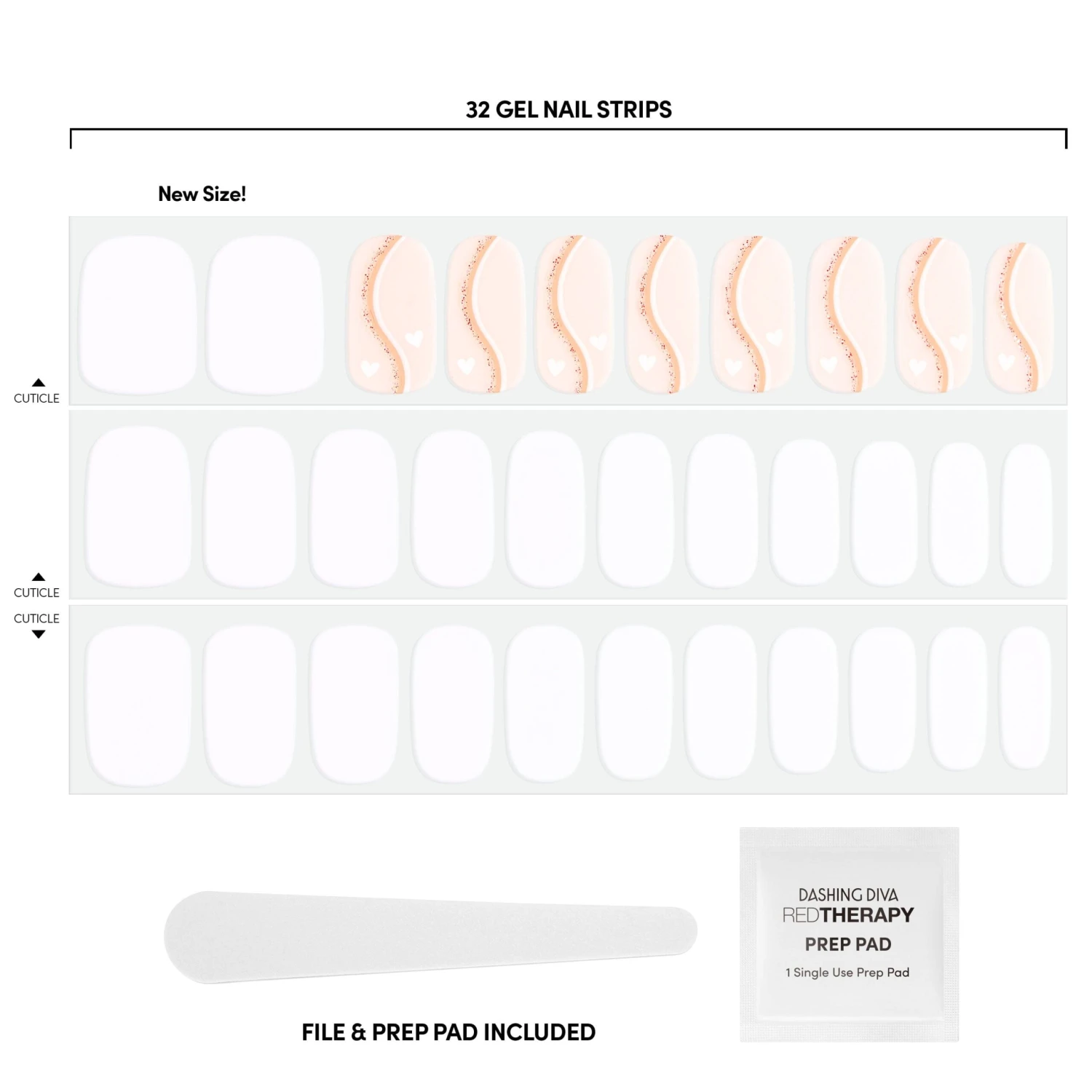 Soft white nail strips featuring heart accents and light pink & white swirls with a glossy, high-shine finish.