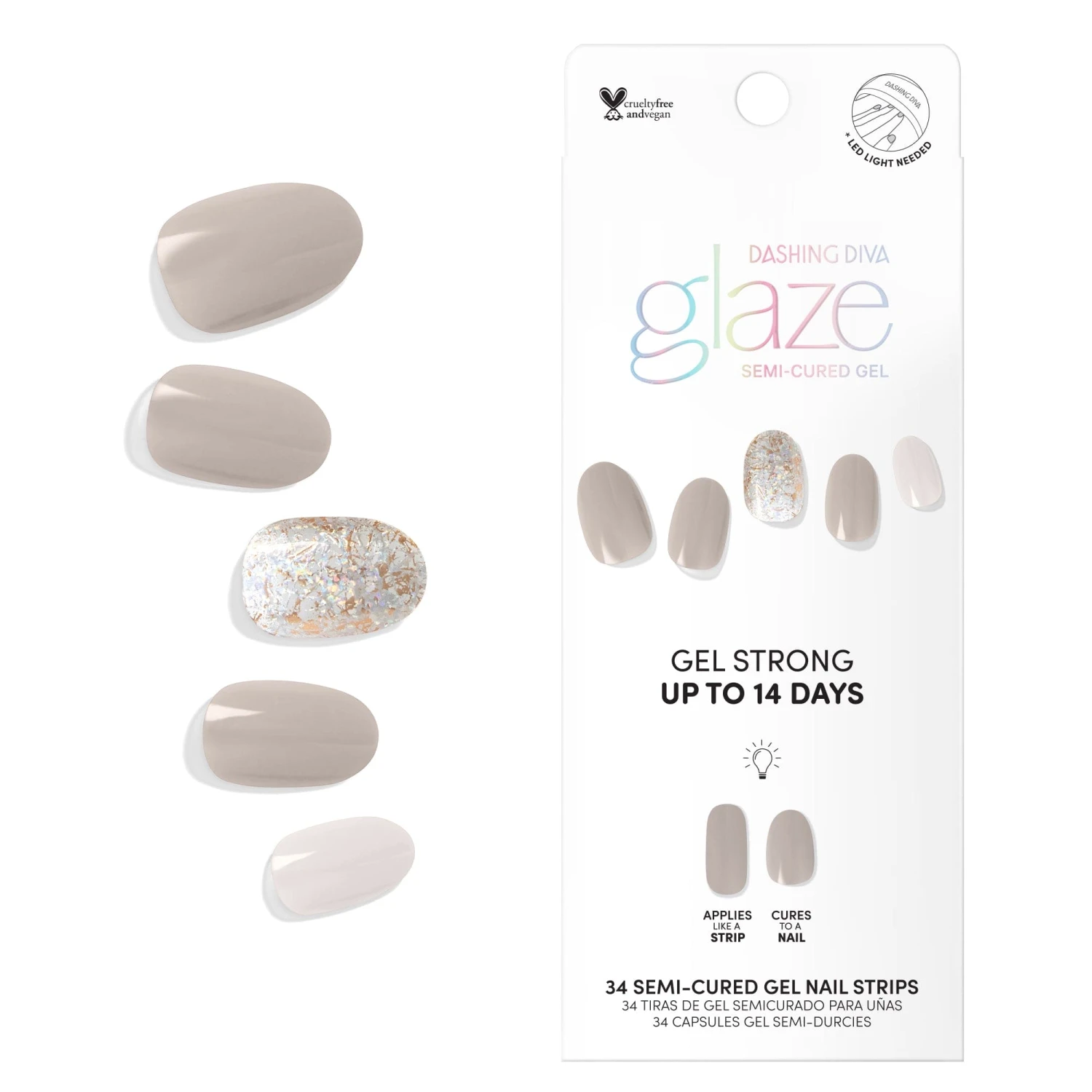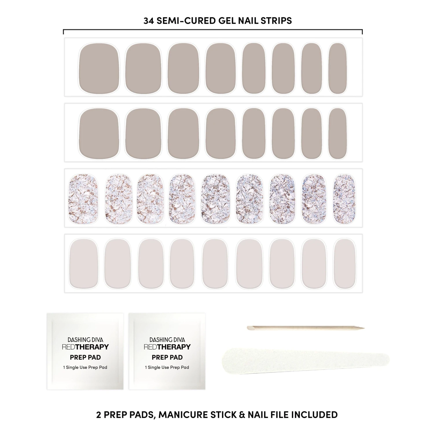 Semi-cured shades of gray & clear gel nail strips featuring bronze and iridescent foil accents with mega volume & maximum shine.