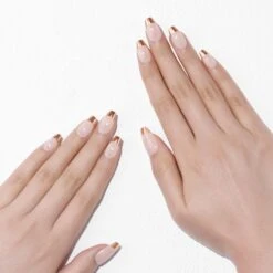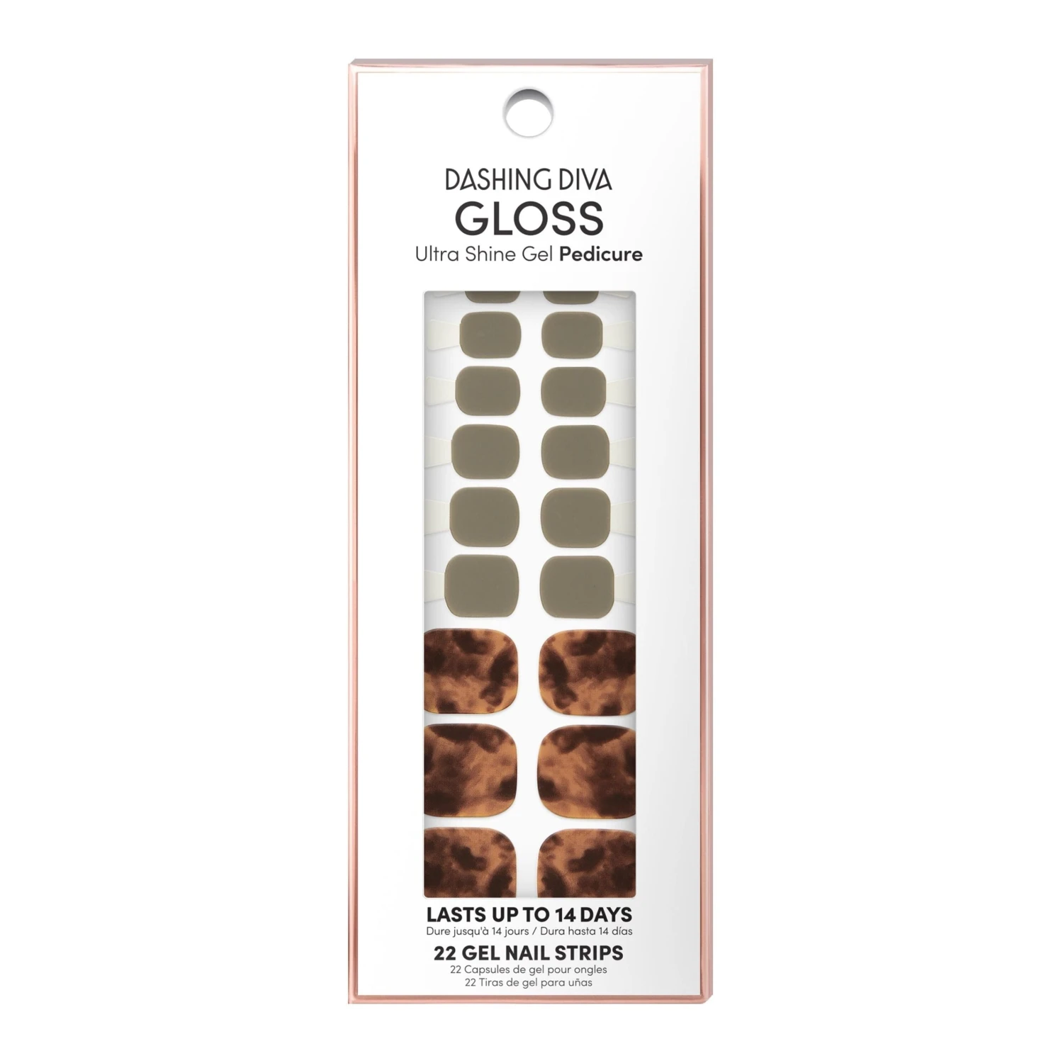 Olive green gel pedicure strips featuring tortoise shell accents with a glossy, high-shine finish. A refined take on animal print.