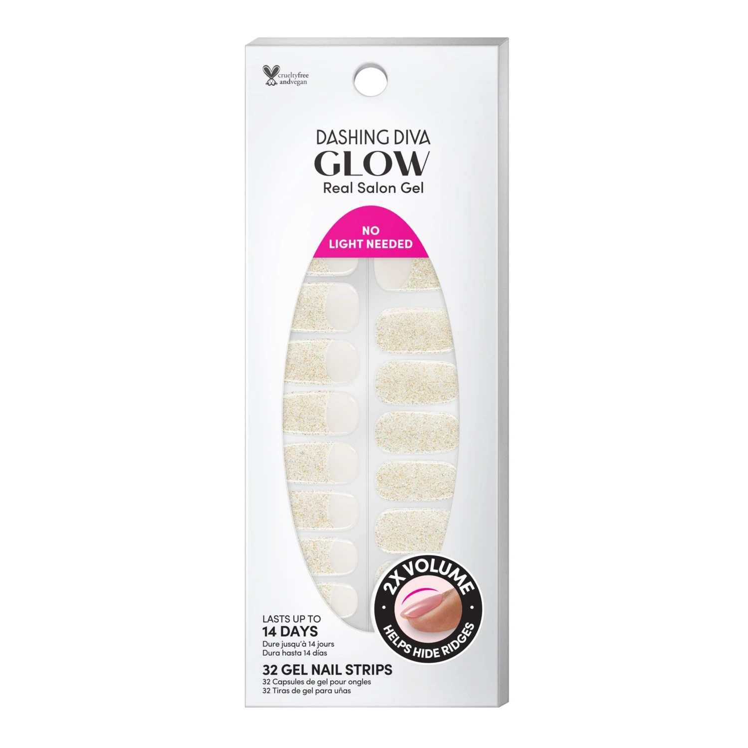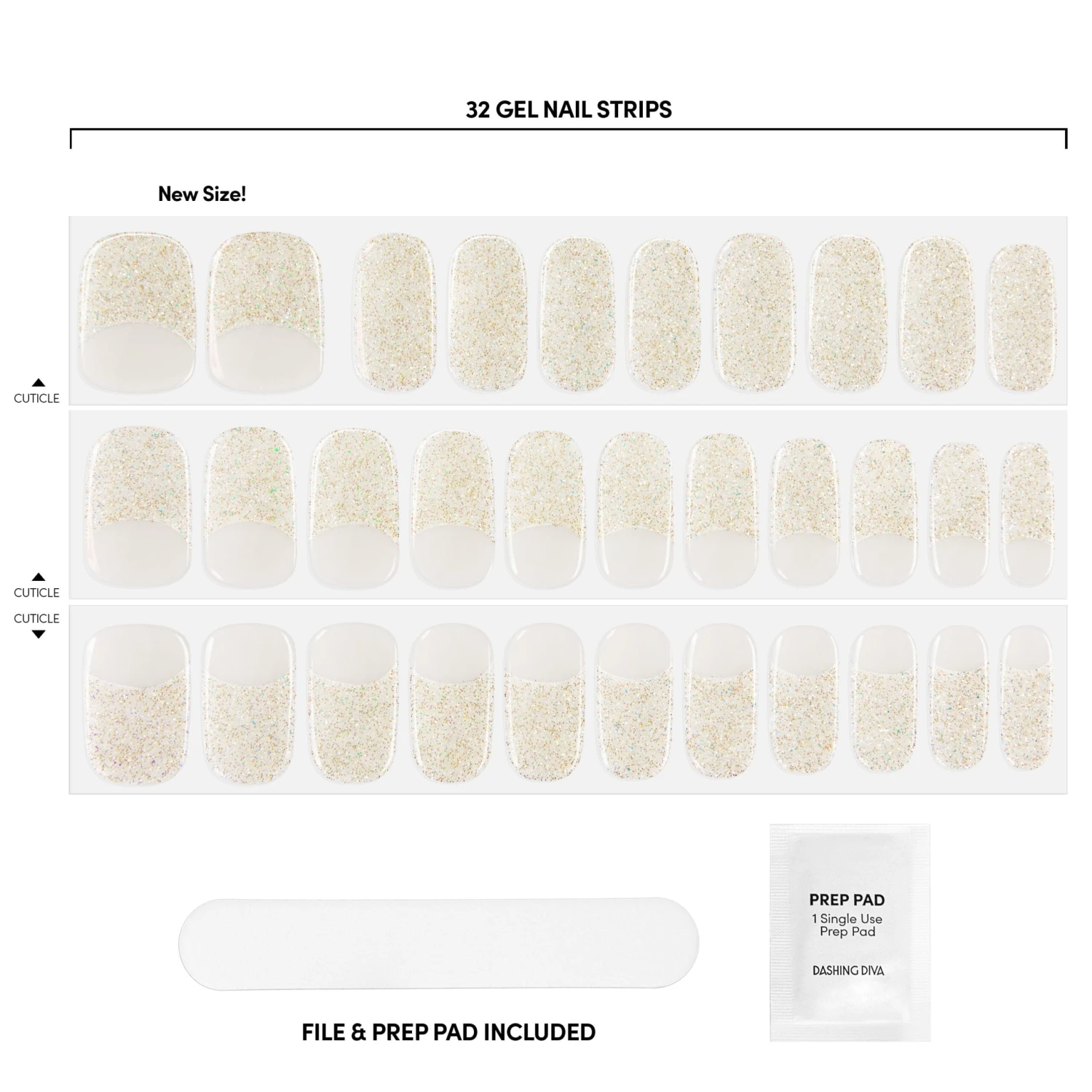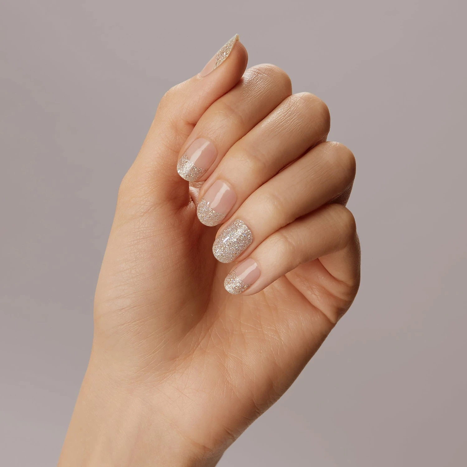 Sheer beige gel nail strips featuring iridescent champagne glitter and glittered french tips with a double gel formula with an ultra-smooth finish.