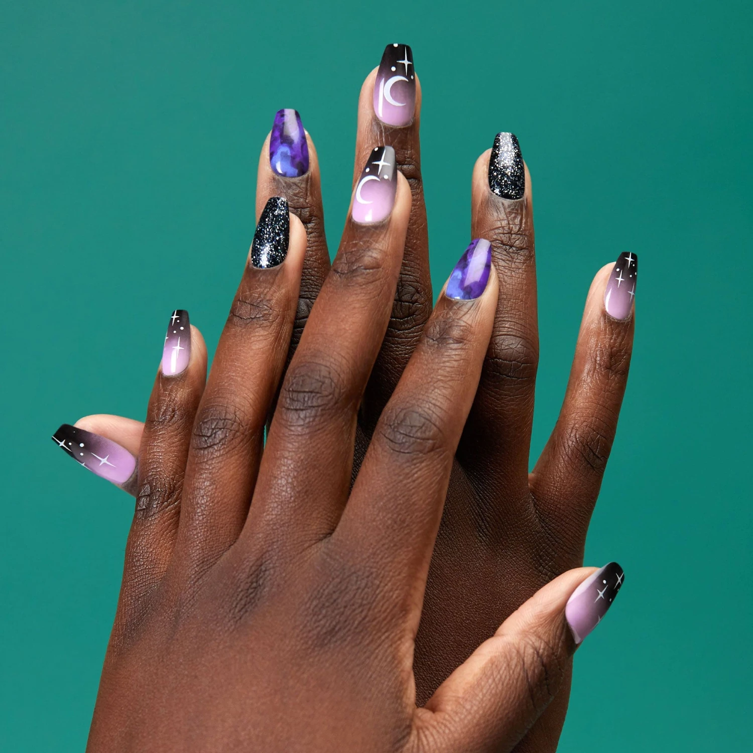 You seem iconically known for being the witch who always brings her A-game. Long length, coffin shape, glossy finish press-on gel nails featuring smoky black & purple accents, silver glitter, and celestial icons. Glow in the dark details.