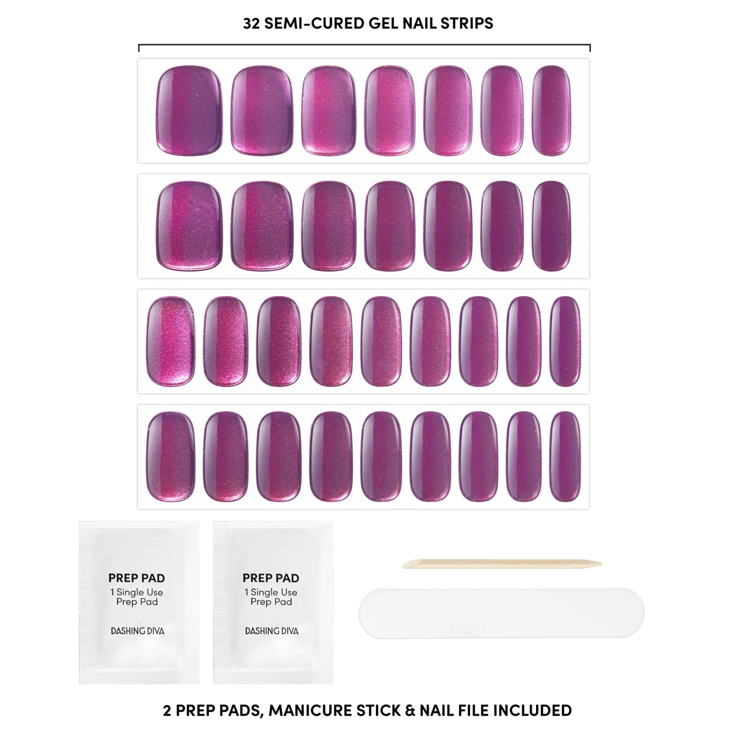 Semi-cured purple metallic chrome gel nail strips with mega volume & maximum shine.