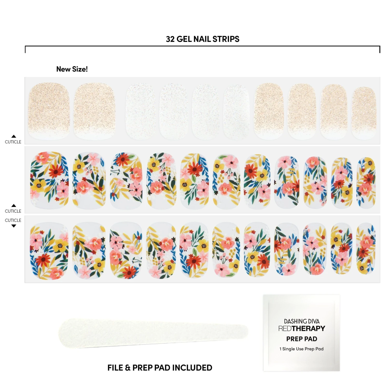 Forever our classic, most romantic set of florals. White gel nail strips featuring multi-floral accents and ombré gold glitter with a glossy, high-shine finish.