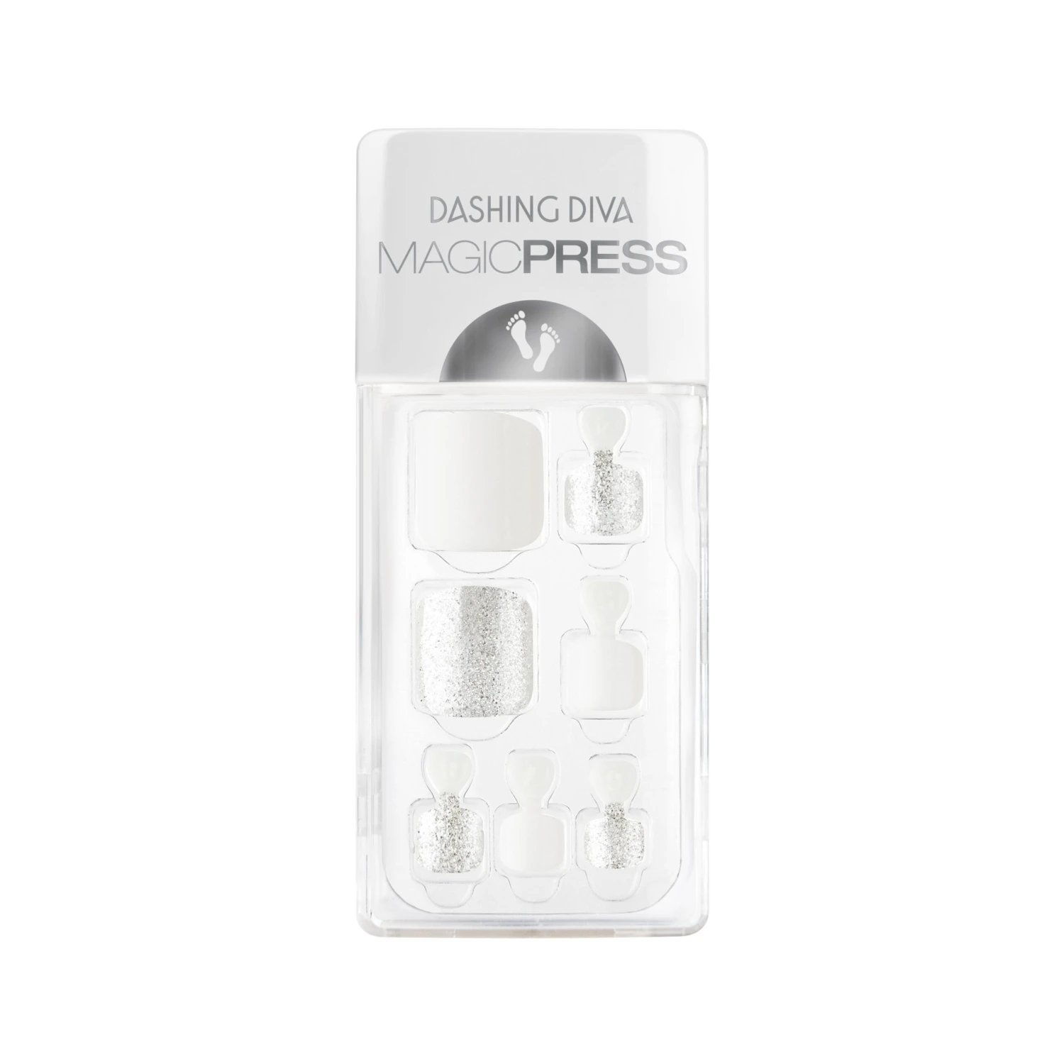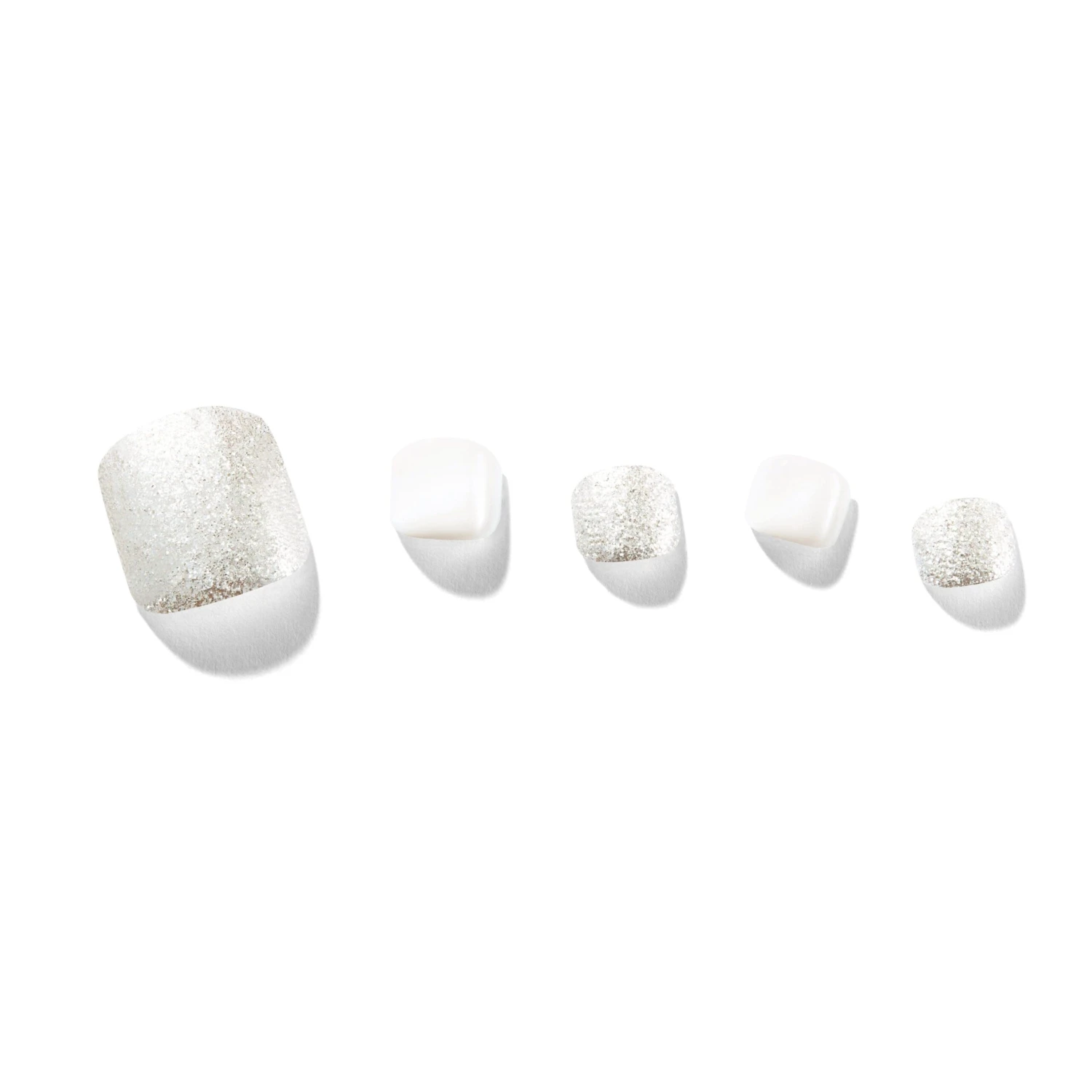 Trendy, timeless, and above all seasonal fashion rules. A white & silver glittered press-on gel pedicure with easy application and comfortable wear.