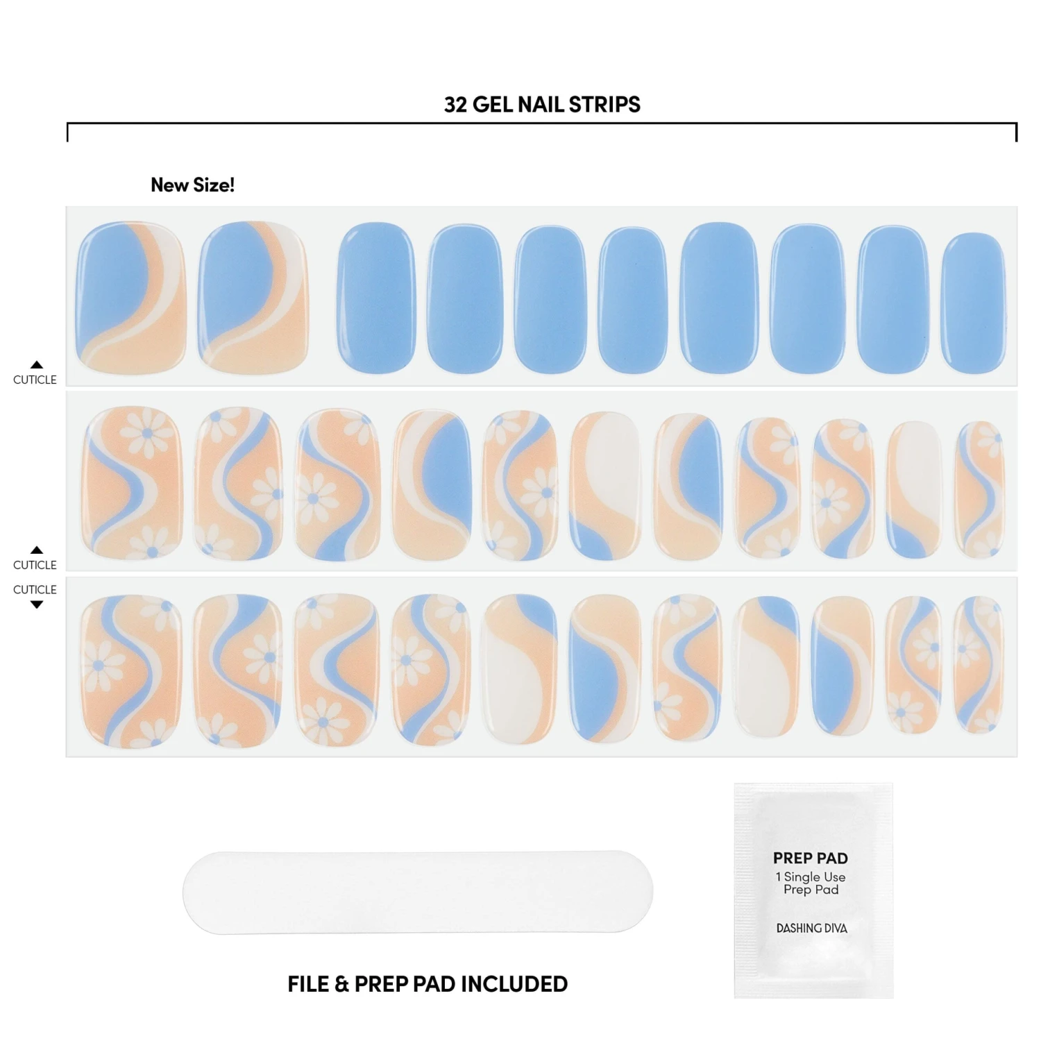 Sky blue gel nail strips featuring abstract swirls and floral accents with a double gel formula for an ultra-smooth finish!