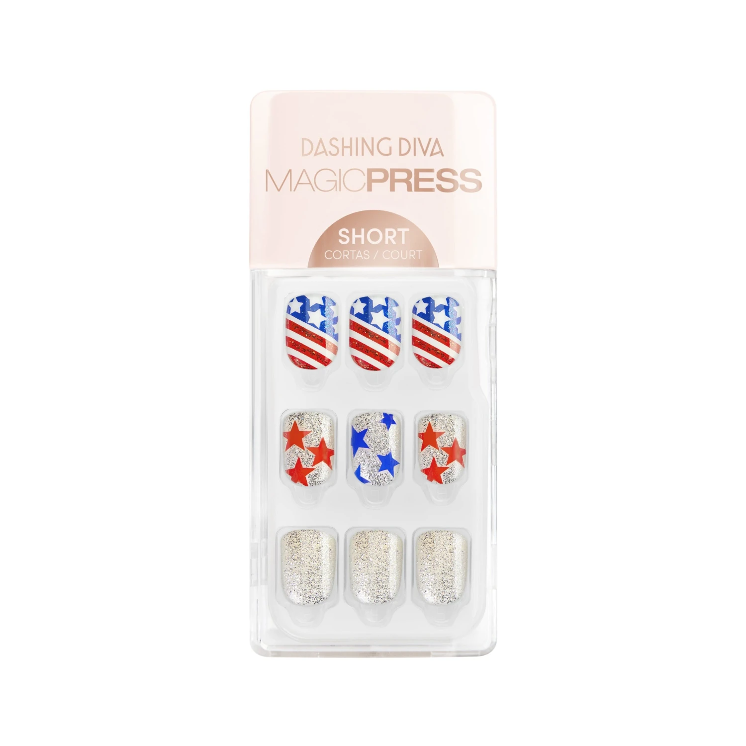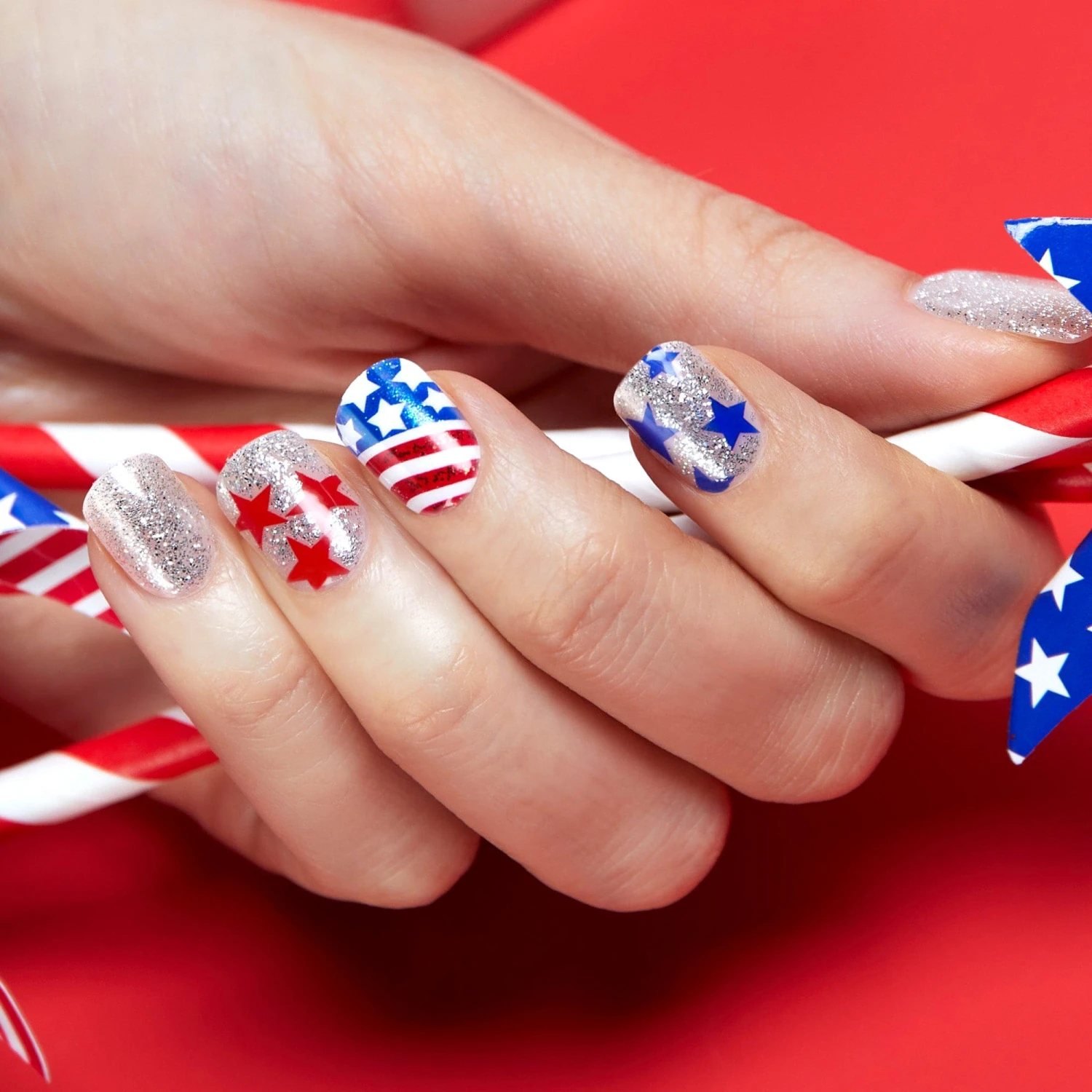 Yankee Doodle went to town, pressing on his mani! Short length, square shape, glossy finish press-on gel nails featuring iridescent silver glitter, star icons, and American flag accents.